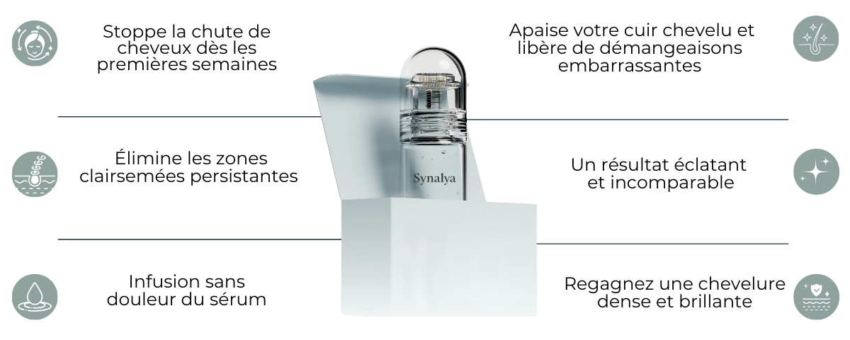 Des cheveux plus épais et une chute stoppée en quelques semaines ! Synalya stimule la repousse et revitalise les follicules dormants grâce à sa technologie de micro-infusion brevetée.