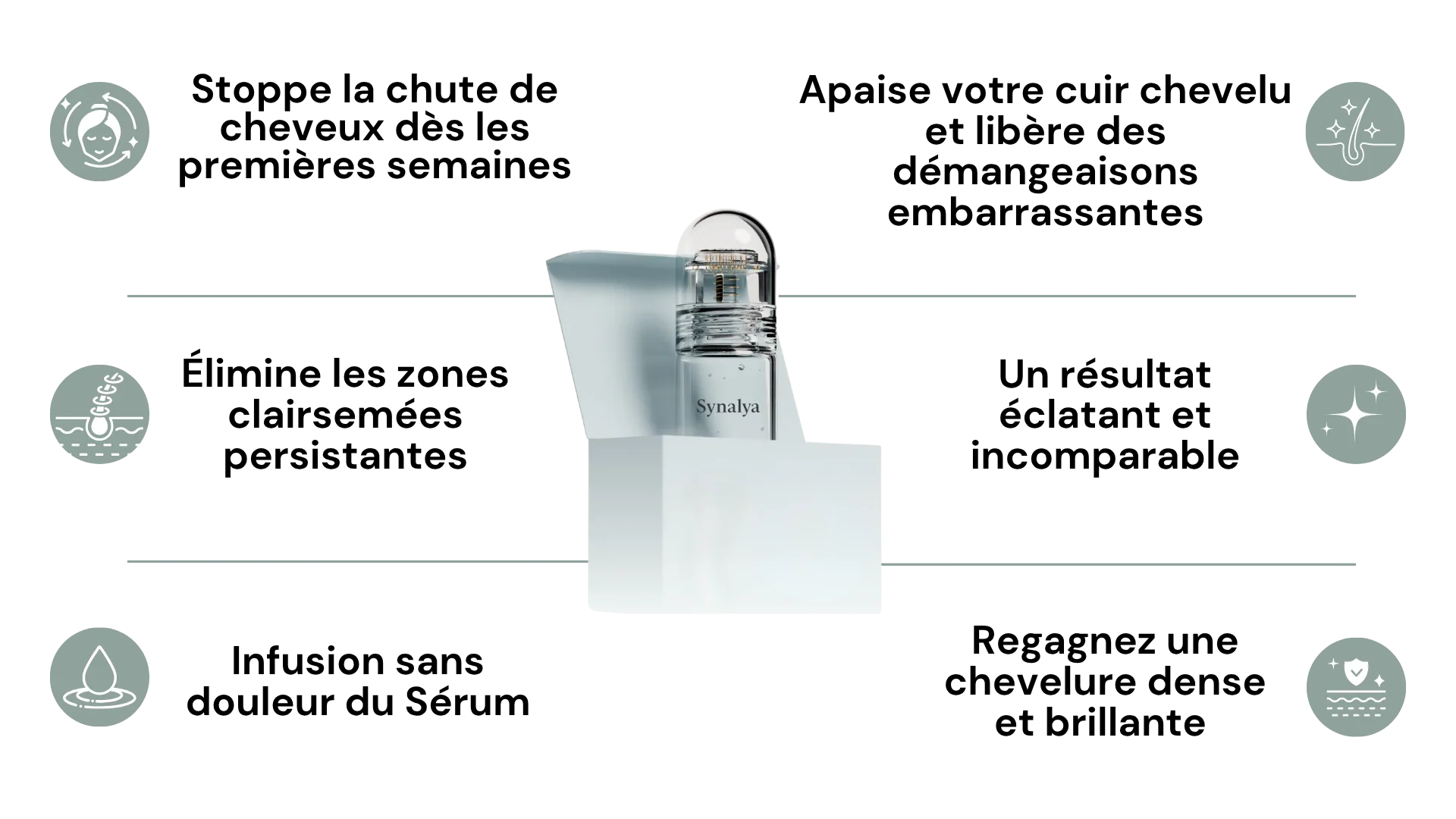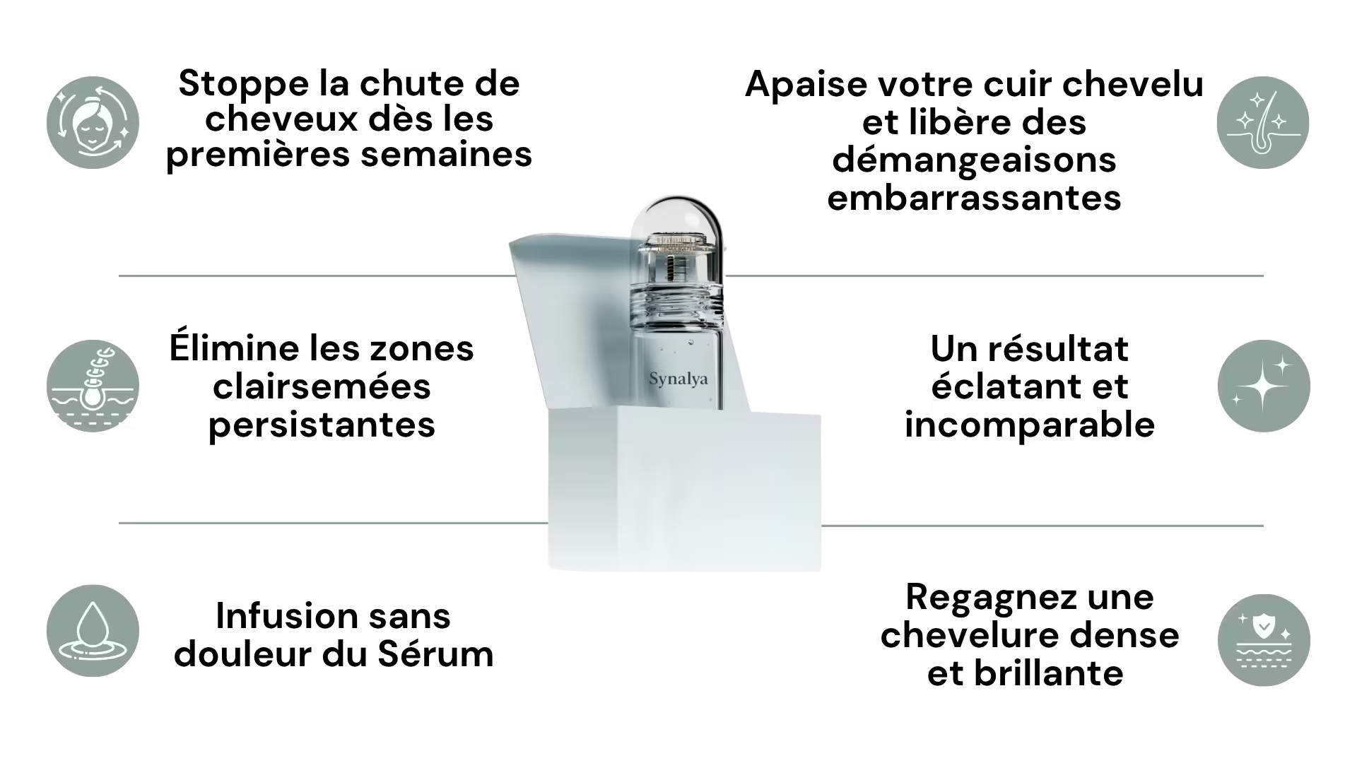 Après la chute post-partum, mes cheveux tombaient par poignées. Avec Synalya, les pertes ont ralenti rapidement, mes tempes repoussent… et surtout, je recommence à aimer ce que je vois dans le miroir.